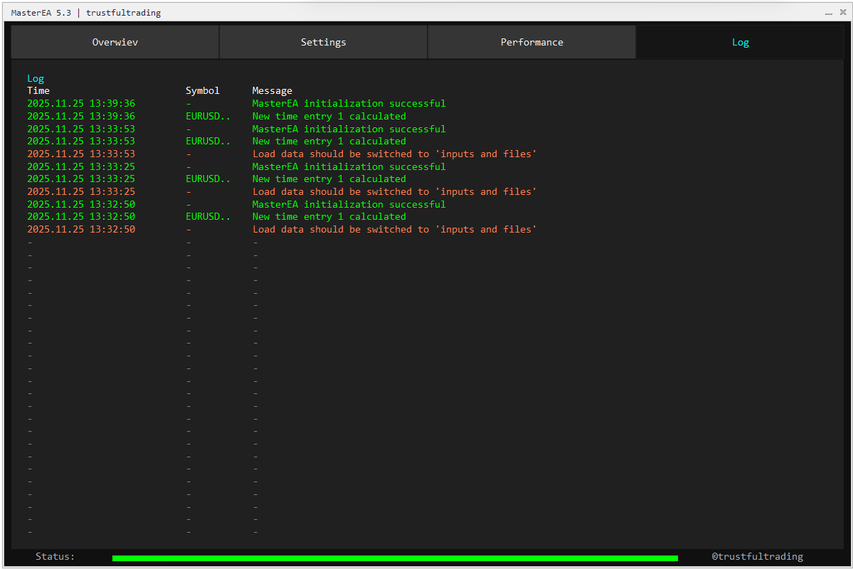 MasterEA is designed as a true plug-and-play solution: install it on your MT5 platform, select your risk level and strategy, and it is ready to trade within minutes. Default settings are pre-optimized, this lowers the chance of configuration errors, and lets you focus on capital allocation and monitoring instead of technical setup.